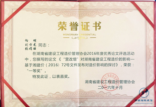 2017年2月28日下午,湖南省建設(shè)工程造價(jià)管理協(xié)會(huì)在省委招待所舉行了2016年工程造價(jià)優(yōu)秀論文交流表彰會(huì),我公司共有11篇論文獲獎(jiǎng),其中向明、劉方龍、張娟麗撰寫的《淺析“營(yíng)改增”對(duì)湖南省建設(shè)工程造價(jià)的影響》獲得一等獎(jiǎng)。