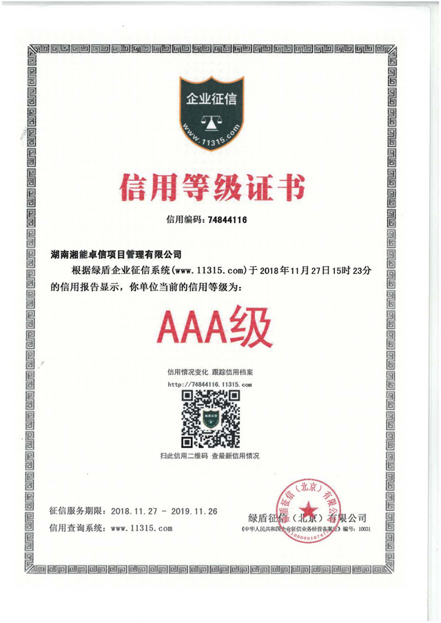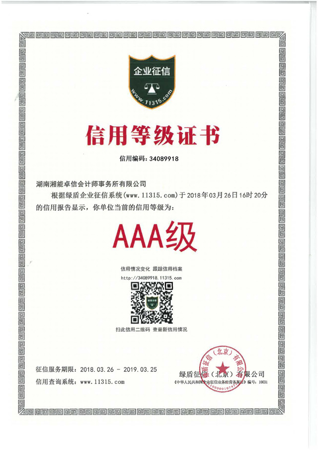 近日,湖南湘能卓信項(xiàng)目管理有限公司及湖南湘能卓信會計(jì)師事務(wù)所有限公司獲得了由綠盾企業(yè)征信系統(tǒng)出具的企業(yè)征信信用等級“AAA”證書。