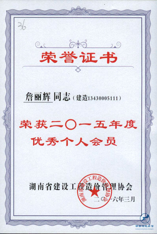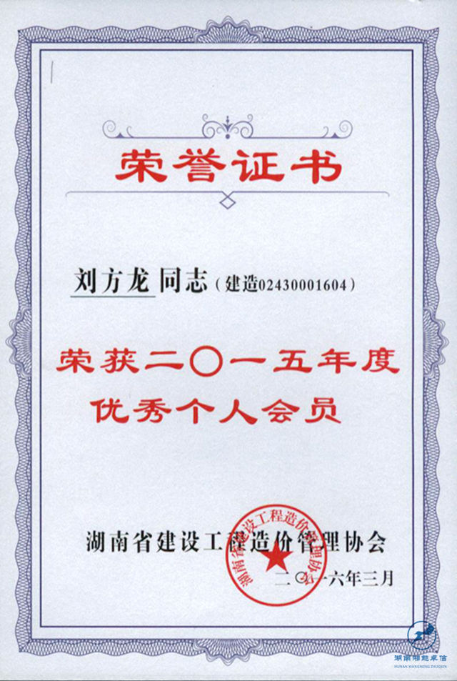 2015年12月湖南省建設(shè)工程造價(jià)管理協(xié)會(huì)組織開展了2015年度先進(jìn)單位會(huì)員、先進(jìn)個(gè)人會(huì)員、先進(jìn)單位、協(xié)會(huì)先進(jìn)工作者評(píng)選活動(dòng),我司獲得“2015年度先進(jìn)單位會(huì)員”稱號(hào),劉方龍、詹麗輝獲得“先進(jìn)個(gè)人會(huì)員”稱號(hào)。